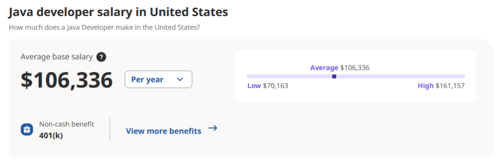 虽然Java开发人员的平均工资很高,但具体数额取决于经验、地点和关键技能。以下是主要招聘网站报道的美国Java开发人员的平均基本工资。
