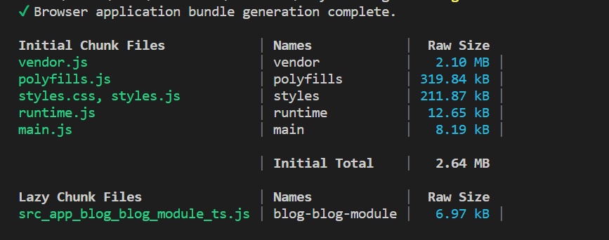上面的输出被分为两部分。Initial Chunk Files 是页面第一次加载时加载的文件。 Lazy Chunk Files 是懒得加载的文件。这个例子中列出了博客模块。