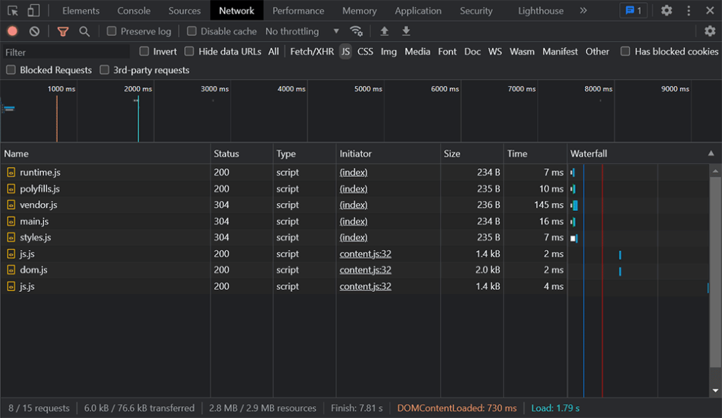 选择 JS 过滤器,只查看通过网络加载的JavaScript文件。在应用程序的初始加载之后,你应该得到类似这样的东西: