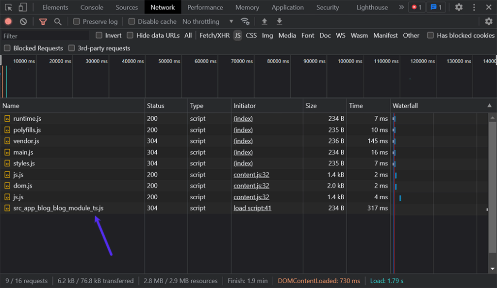 当你导航到 /blog 时,你会注意到一个新的块,src_app_blog_blog_module_ts.js,被加载。这意味着你的模块只有在你导航到该路线时才被请求,而且它被懒散地加载。网络日志看起来应该是这样的: