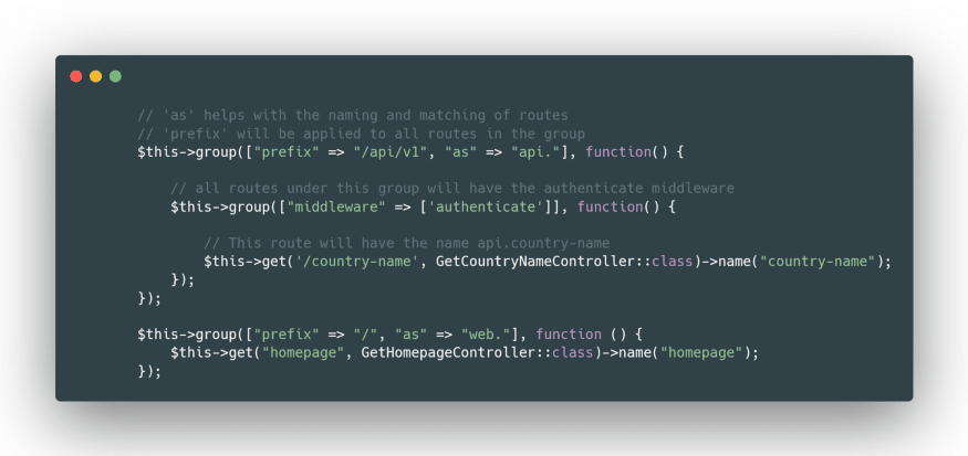 为我们拥有的所有路由分配一个中间件,允许我们将它们组合在一个组中,首先使用 group 方法。需要考虑的一点是,中间件是按照应用到组中的顺序来执行的: