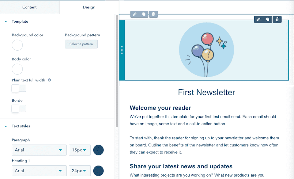 然后,您将能够使用拖放编辑器自定义电子邮件。除了添加和删除字段之外,您还可以单击模块左上角的设计来做出美观的决定。设置背景颜色,选择您的字体系列,自定义按钮的样式等。