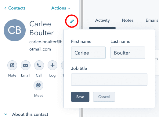 您可以通过将鼠标悬停在该区域上并单击弹出的铅笔图标轻松更改或添加信息到联系人卡片中的任何字段。