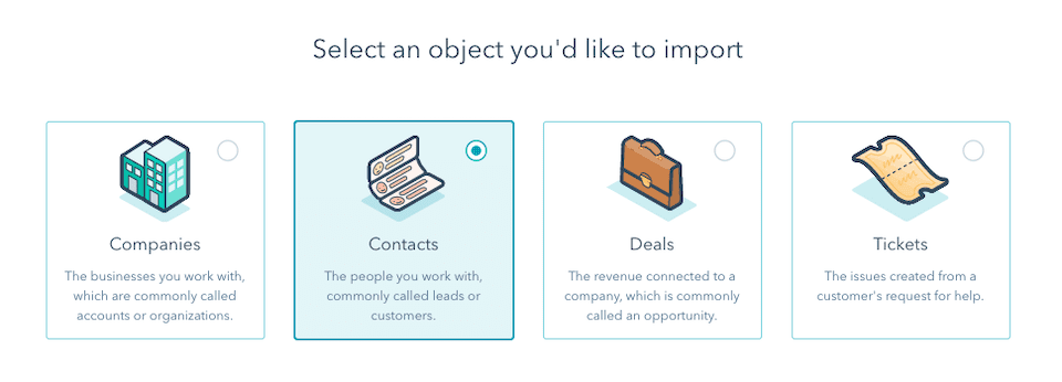 要导入您希望作为联系人的常规人员列表,请单击计算机中的文件,然后单击下一步。您可以选择导入一个或多个文件,然后您可以选择导入一个或多个对象。例如,单对象文件将仅包含有关联系人的信息;多目标文件将包含有关联系人和公司的信息。做出选择后,您将选择要导入的一个或多个对象。