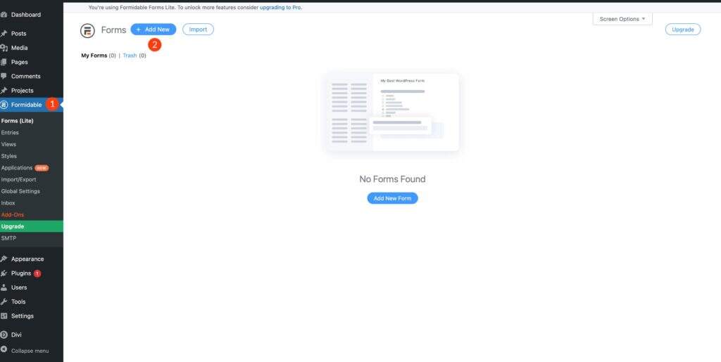 接下来,您将创建一个新表单。单击 Formidable > Forms (lite)。然后单击 Add New 按钮。