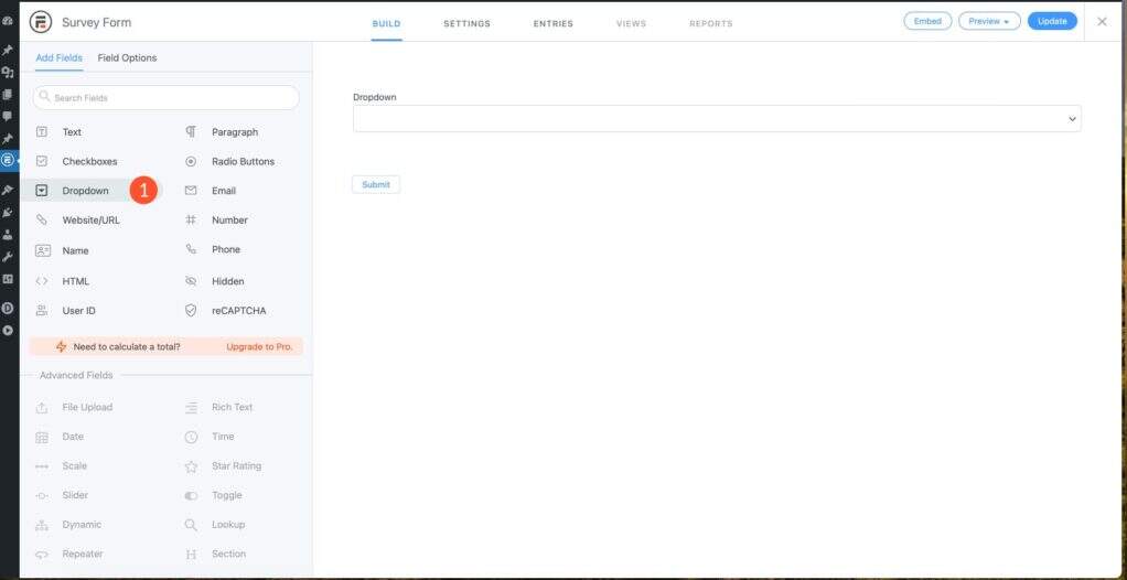 下一步是在表单中添加字段。在表单中添加一个 dropdown 字段。
