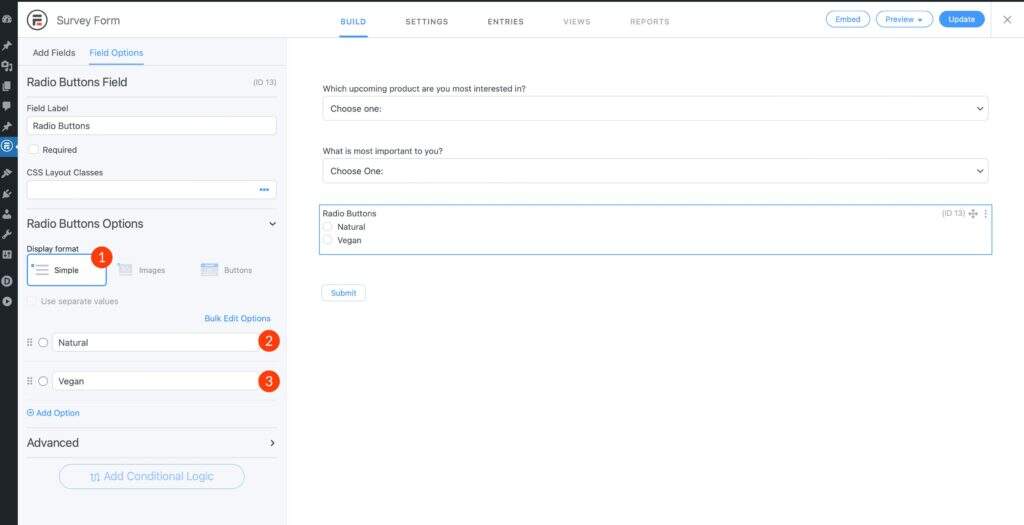 将显示格式设置为 simple。然后,添加以下两个选项:Natural 和 Vegan。