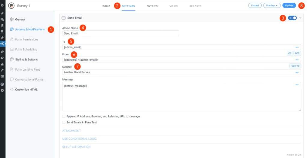 下一步是告诉 WordPress 应将条目发送到的电子邮件地址。导航到表单 settings 选项卡。接下来,单击 Actions & Notifications。然后,将 Send Email 切换为打开。单击切换按钮旁边的下拉箭头以将其展开。您将填写 Action Name,然后将 to 字段设置为管理员电子邮件,或输入电子邮件地址。添加皮革制品调查的主题行。最后,再次单击 update 按钮。