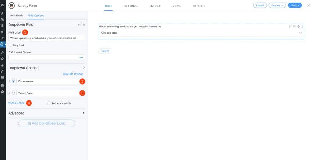 单击下拉字段以开始向其添加选项。给你的字段一个字段标签。类型您最感兴趣的即将推出的产品是什么?进入领域。接下来,选择第一个选项,键入 Choose one。在下一个选项字段中,输入 Tablet Case。接下来,单击 Add Option 按钮以添加另一个选项。
