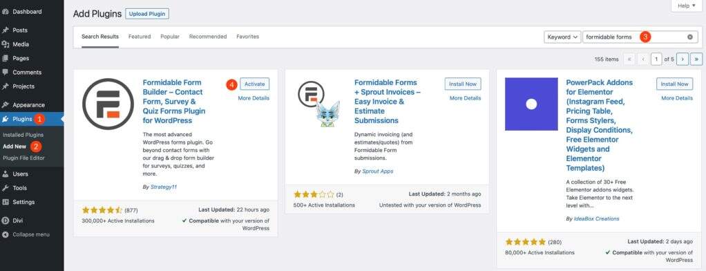 第一步是安装强大的表格。只需登录到您的 WordPress 站点,然后在您的 WordPress 仪表盘中导航到插件 >安装插件。接下来,在搜索字段中搜索强大的表格。最后,单击启用按钮以安装 Formidable Forms。