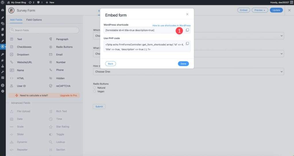 插件选项包括几种将调查表嵌入页面的方法。您可以将其直接添加到您网站上的页面、创建新页面或手动插入代码。对于此示例,您可以使用简码将表单添加到您的页面。为此,您将单击表单构建器中的 embed 按钮,选择 insert manually,然后选择 WordPress shortcode 选项。生成短代码,然后将其复制并粘贴到您的页面。
