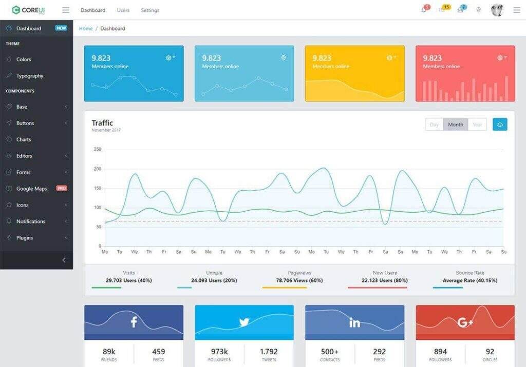 CoreUI是另一个华丽且免费的Bootstrap管理模板,您需要创建出色的用户界面。这个基于Vue和Bootstrap的开源模板具有50多个即用型和可自定义的UI组件。因此,这将有效地将开发过程加快50%。为了让您的仪表盘充分发挥其任务,应提供有用的组件、小工具、图表、表格、表单和其他相关元素。使用这个免费的VueJS管理模板,您可以拥有许多可以完成任务的基本元素。如果您想获得功能更丰富的版本,它还附带高级版本。