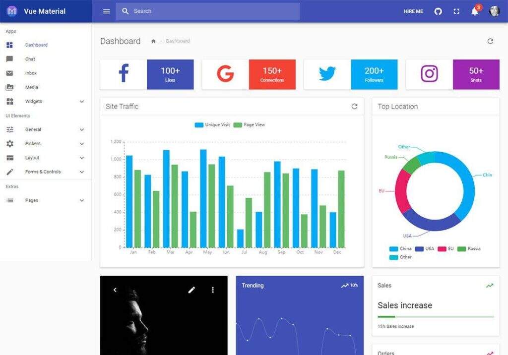 Vue Material Admin是使用Vue和Material Design构建的。这是一个免费资源,您可以将其用于您的个人和商业项目。此模板具有可使用的应用程序,例如聊天、收件箱、小工具、选择器、表单等。它的一堆组件也集成到模板中,因此它可以为它的魅力做出贡献。