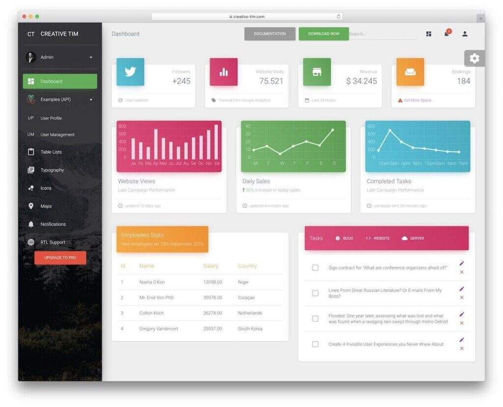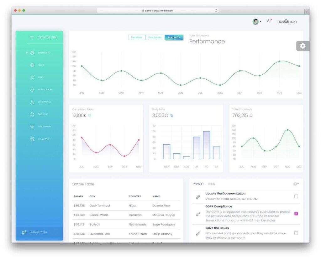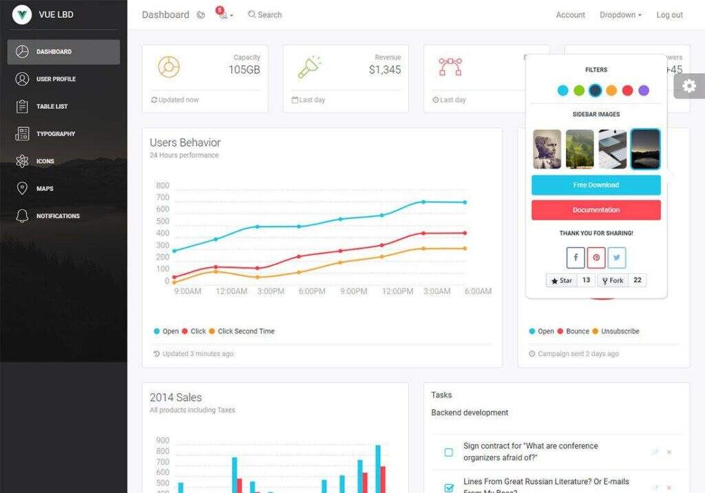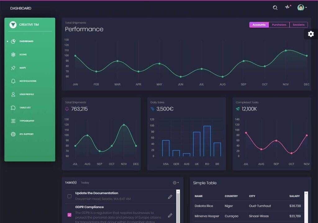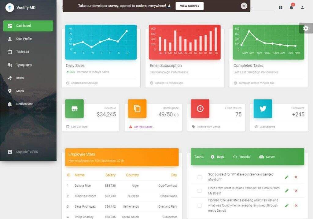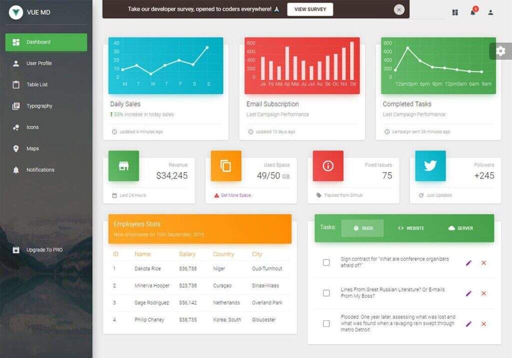 Vue Material Dashboard是适用于您的应用程序和Web项目的一流解决方案。它带有功能性的前端和后端,确保您立即开始处理任务。顾名思义,这个模板具有Material Design的外观,众所周知,现在非常流行。