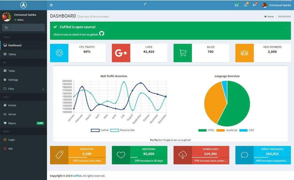 CoPilot有一个优秀的Vue-CLI搭建的结构脚手架,并使用了网页包。这个免费的VueJS管理模板具有浏览器支持,因此无论您使用何种浏览器,您都可以访问仪表盘。更重要的是?对于这个惊人的免费赠品,还有通知、搜索功能、表格等可供探索。