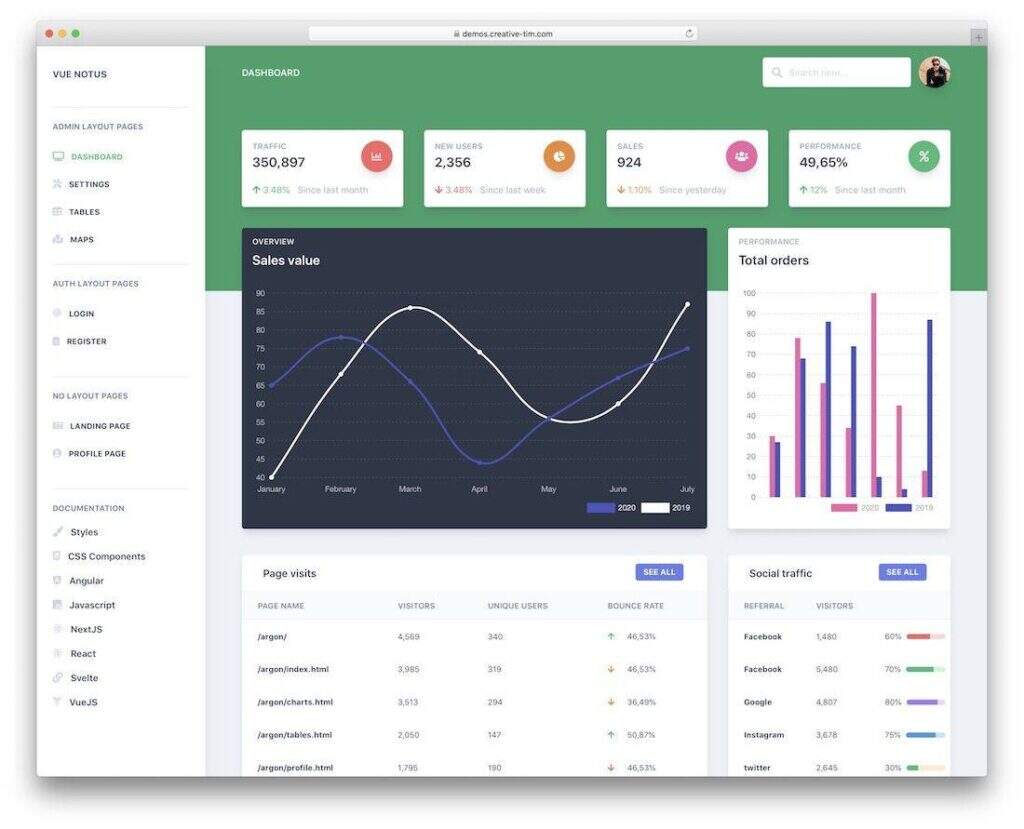 Vue Notus是另一个非凡的免费VueJS管理模板,它提供了许多有用的材料。首先,Vue Notus作为一个完整的UI工具包和一个管理面板提供,因此您可以使用这个工具创建整个项目,包括前端和后端。该设计也是现代且简约的,确保每个人都能在浏览数据时获得愉快的体验。