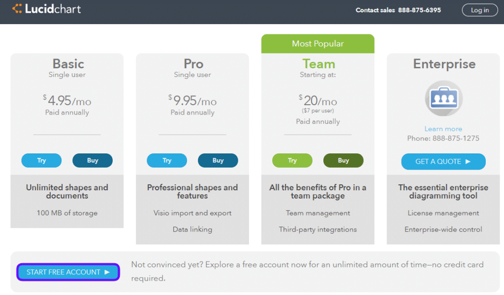 首先,前往Lucidchart。单击屏幕右上角或中间的“免费注册”按钮注册一个帐户。您将被带到此页面并有机会开始试用。现在,向下滚动,直到看到蓝色的“开始免费帐户”按钮并选择它。
