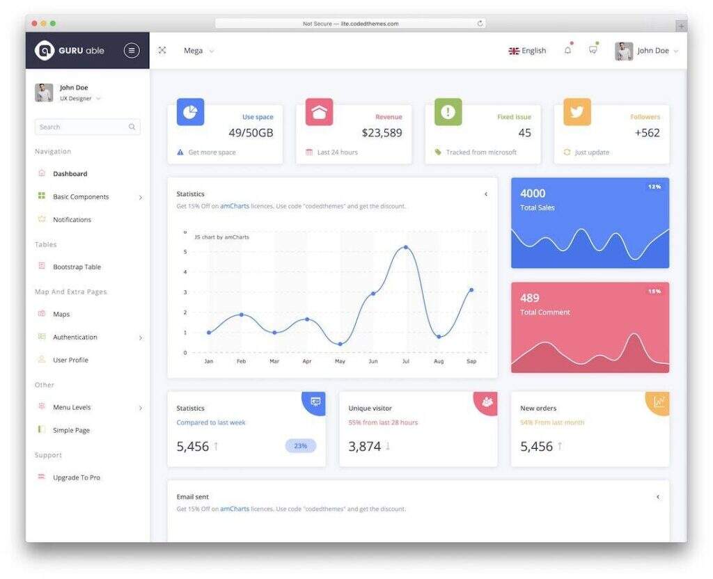 即使Guru Able是免费的,您仍然可以为各种项目和应用程序创建快速原型和仪表盘。当然,所有功能可能都不可用,但仍有足够的内容供您使用,让您一帆风顺。Guru Able的代码注释良好且对初学者友好,因此您可以毫不费力地进行编辑和改进。您甚至可以获得开箱即用的垂直和水平布局。