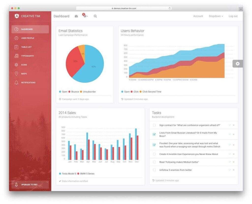 Light Bootstrap Dashboard Angular适用于从Web应用程序后端到CRM、项目管理系统等的任何事物。毕竟,您可以对其进行相应的自由微调,并使其精确地遵循您的特定方向。您还可以为侧边栏选择六种颜色,并使用图像作为背景。