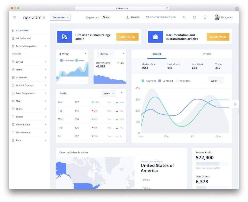 在套件中,ngx-admin 为每个用户提供了广泛的 UI 组件,具有出色的自定义功能。图表、地图、表格、四个主题、两个仪表盘和频繁更新都是您可以在旅途中享受的好东西。但首先,请查看多种样式的实时预览并见证可能发生的事情。