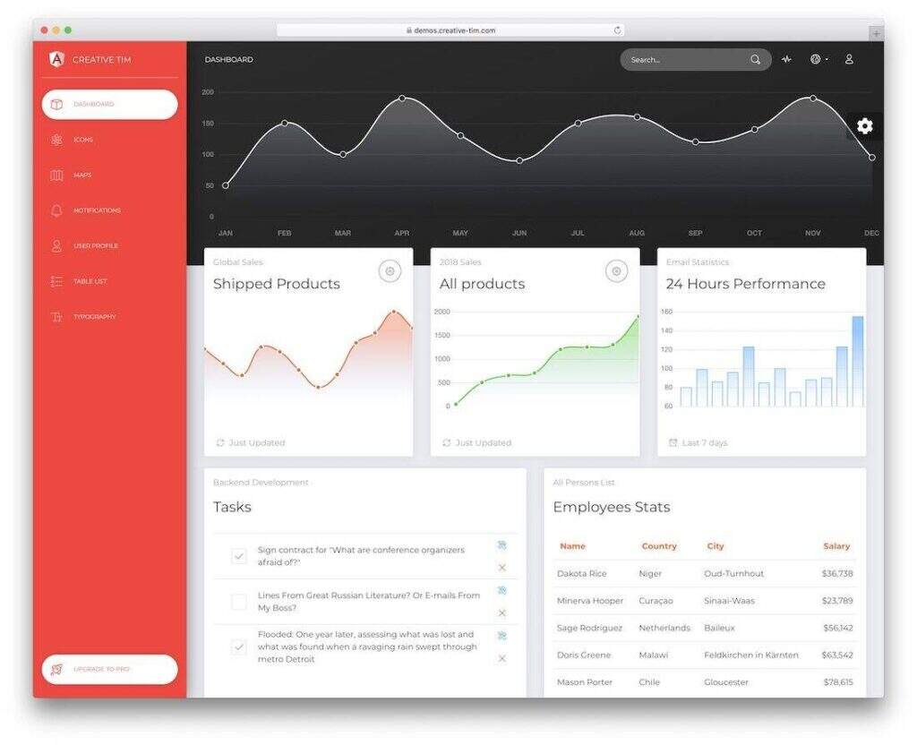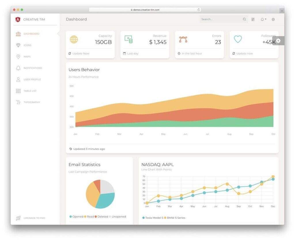 该捆绑包包括各种现成的页面、彩色皮肤、带有添加图像背景选项的侧边栏、谷歌地图,嗯,你明白了它的要点。作为一个免费的替代方案,Material Dashboard Angular附带了大量实用的东西,可以帮助您从一开始就正确地开始。