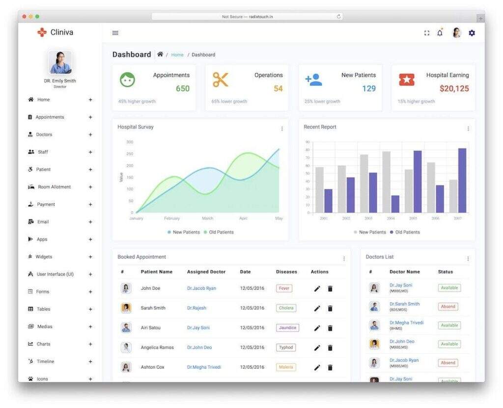 明暗模式、RTL支持、Material Design、日历、聊天和任务应用程序、七种配色方案和两种不同的仪表盘样式只是Cliniva为您准备的一些特色。此外,Cliniva 具有用于预约、医生、患者、员工和房间的各种模块。立即使用Cliniva为任何医院或其他医疗机构创建管理员。