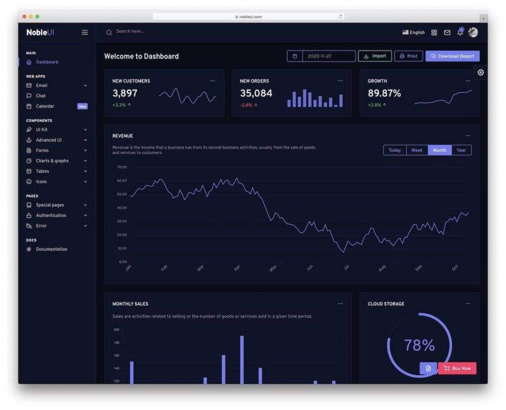NobleUI提供了以套件中的样式启动项目所需的所有内容。NobleUI使用预定义的应用程序、表单验证、事件日历、多个图表和大量页面,确保每个人都能毫不费力地充分利用它。该代码也易于理解,非常适合初学者和专业人士。