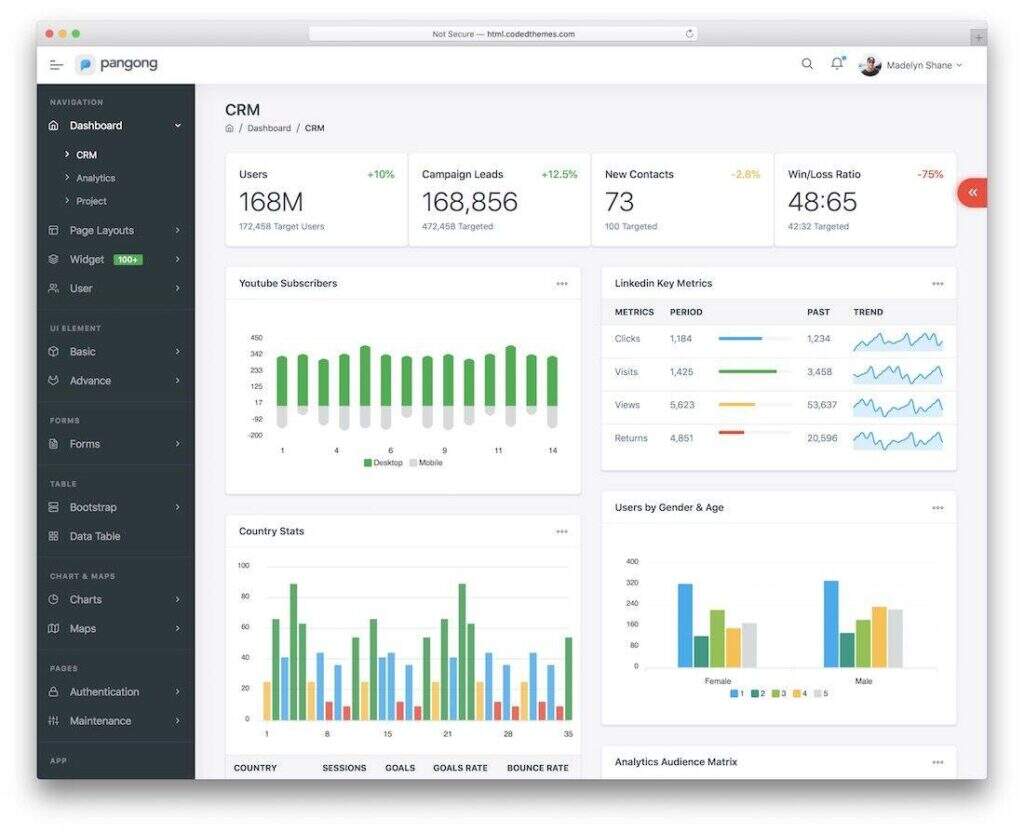 如果您正在寻找基于Bootstrap的多功能Angular管理仪表盘,Pangong是一个可以考虑的工具。它现代且吸引眼球,兼容所有设备、网络浏览器和视网膜屏幕。该代码易于消化,确保所有级别的Web开发人员都能充分利用Pangong。