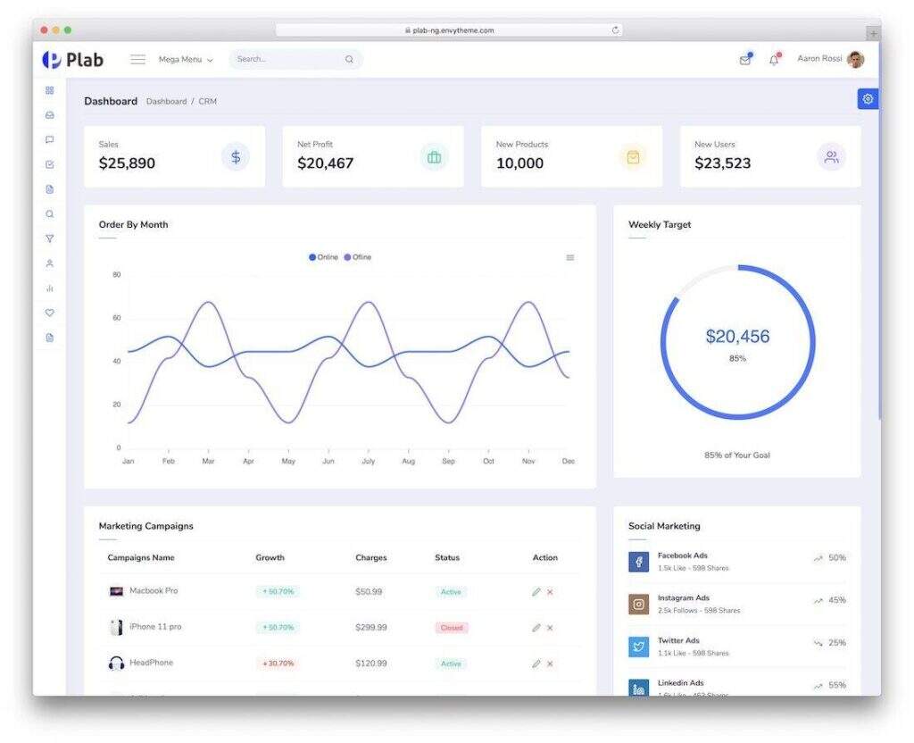 Plab是多个PHP框架版本中的全能管理模板。当然,你也会找到一个Angular的。Plab还为捆绑销售、电子商务、CRM、项目和分析提供了五个不同的仪表盘。