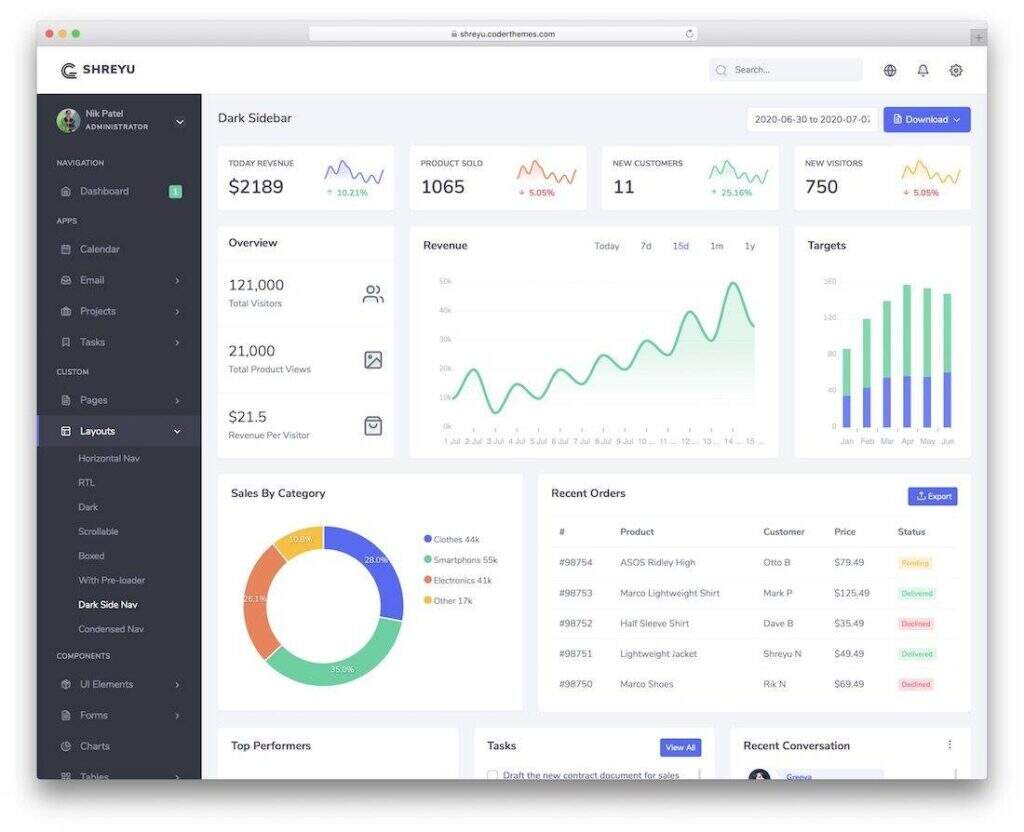 Shreyu也为您提供的一些功能是toast通知、表单向导、图标、数据表、日期和时间选择器,并且列表不胜枚举。至于页面,您将获得发票、资料、定价、登录/注册、恢复密码、错误布局等。凭借干净和无干扰的设计,Shreyu将让一切都映入眼帘。