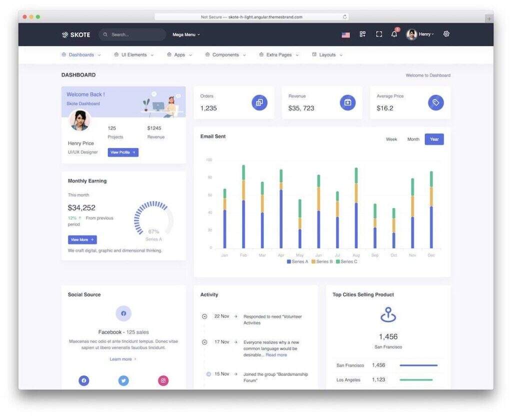 你可能以前听说过Skote,因为它可以在各种框架中使用,包括Angular版本。这个基于Bootstrap框架的管理模板为构建swift应用程序提供了一个惊人的包——无需从头开始。您可以立即从不同的明暗样本和八种不同的布局类型中进行选择。许多不同的组合将让您从一开始就开始Skote也完全兼容RTL。