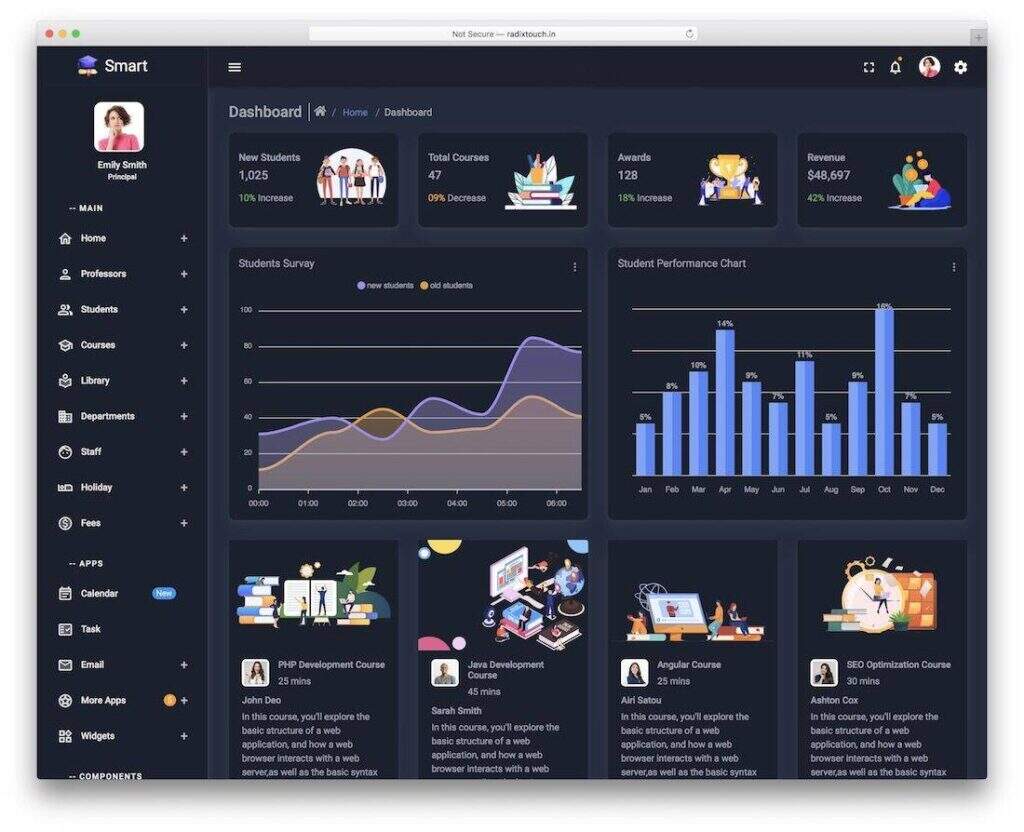 Smart包括学生、课程、教职员工、图书馆、教授和其他必要部门和领域的页面。还有一个选项可以在深色和浅色外观之间进行选择,并创建一个成熟的RTL解决方案。该软件包包括两个仪表盘、七种颜色皮肤、功能日历和任务应用程序、范围滑块和Google字体。使用Smart简化流程并增强您的工作流程。