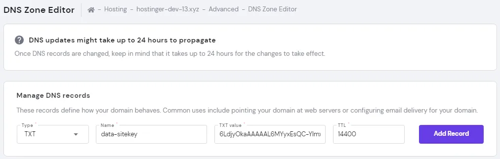 然后,将密钥添加到DNS记录。在Manage DNS records中,在Name下添加data-sitekey ,在TXT value下添加您的密钥。单击添加记录按钮。注:不同DNS管理面板,可能会有所差异。