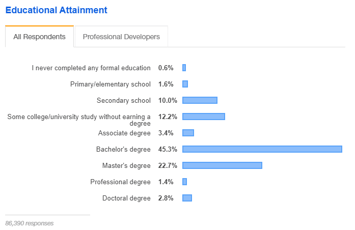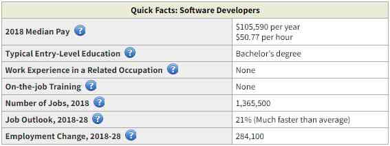 另一方面,Payscale估计软件开发人员每年7.12万美元,非常高的范围为5万至10.4万美元。在这两个数据源之间,Glassdoor建议每年7.65万美元,数据来自数十万工资。