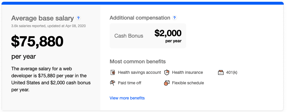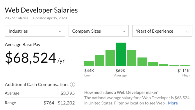 在撰写本文时,Glassdoor的估计列出了一个类似的数字,即6.85万美元/年。即使在频谱的低端,你仍然可以每年赚4.4万美元,而顶级Web开发人员的收入为11.1万美元。