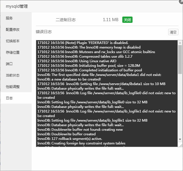 查看当前mysql日志的错误日志,可用于分析当前mysql运行过程中的警告和错误信息,以及mysql每次启动和关闭的详细信息。提供二进制日志的关闭功能和错误日志的清空功能。