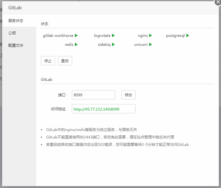 显示当前GitLab中服务的运行情况和服务的停止与重启,还有GitLab端口的修改。