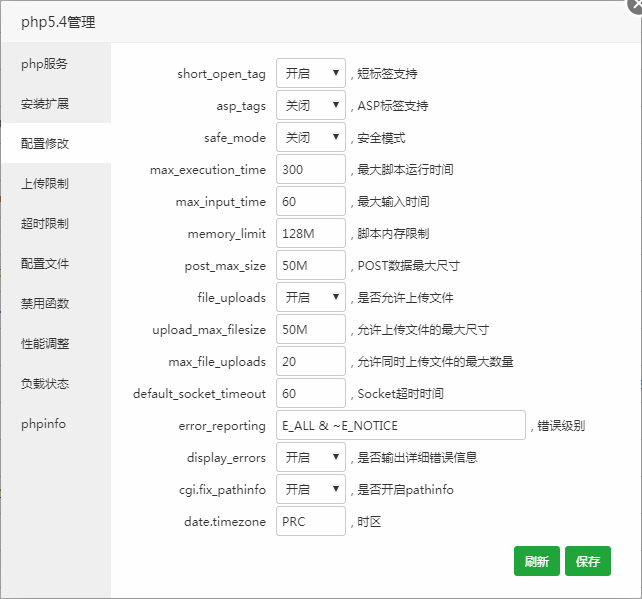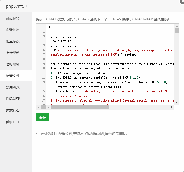 修改当前的PHP当前版本的配置文件后保存,如果需要使当前配置生效,请在PHP服务管理中重载配置文件。