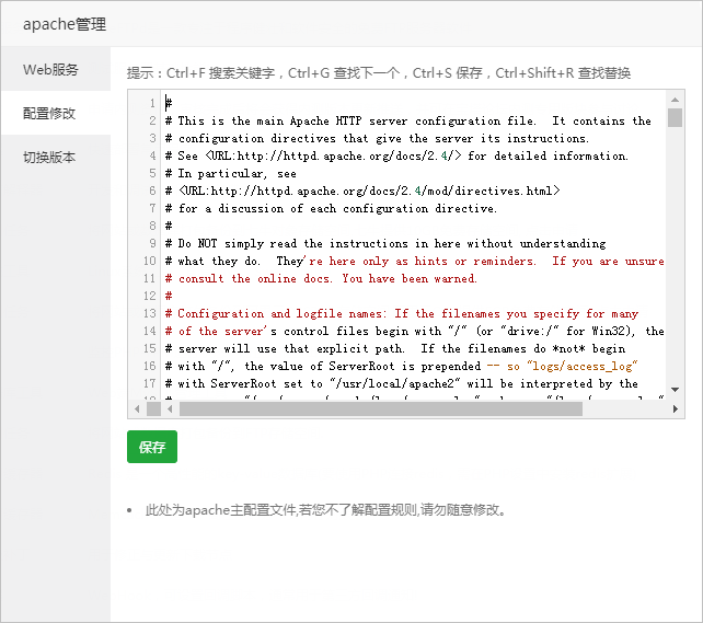 注意事项:此处为apache主配置文件,若您不了解配置规则,请勿随意修改。
