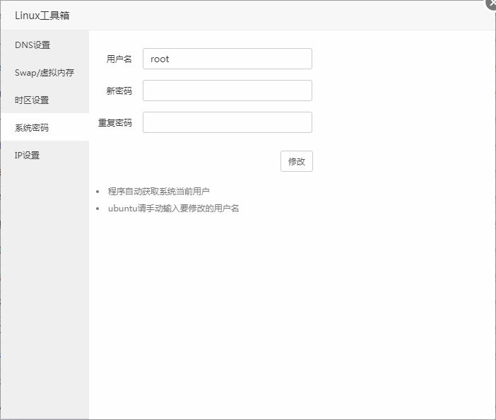 修改当前服务器系统密码。输入需要修改的新密码,重复输入,点击修改,即可。