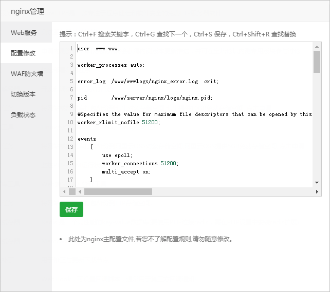 注意事项:此处为nginx主配置文件,若您不了解规则,请勿随意修改。
