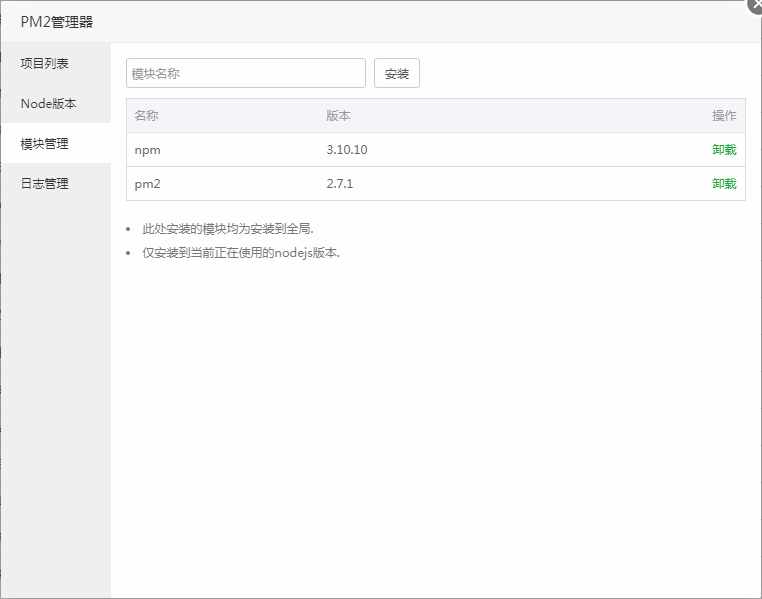 此处安装的模块均为安装到全局。仅安装到当前正在使用的nodejs版本。