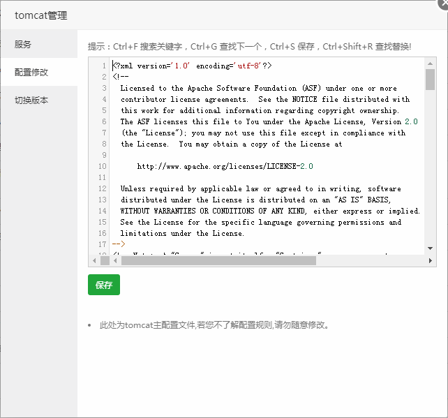 注意事项: 此处为tomcat主配置文件,若您了解配置规则,请勿随意修改。
