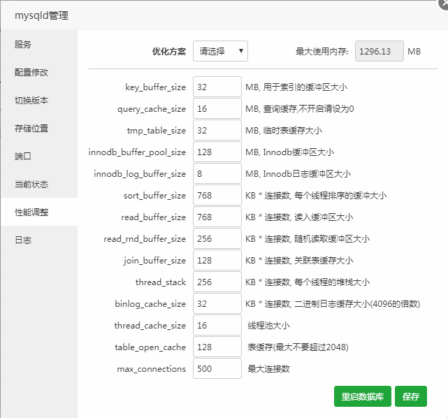 注意事项:自行调整数据缓存等性能时,请根据最大使用内存来调整相关数据。