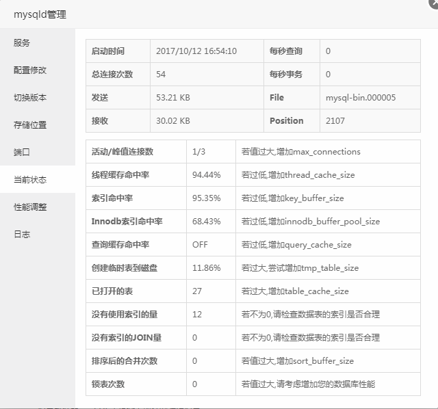 显示当前mysql的状态数据,如启动时间、连接数、发送、接受、查询数等等。