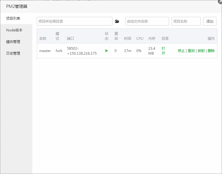 管理和添加node项目。管理node项目,提供项目停止,项目重启,端口映射,项目删除。