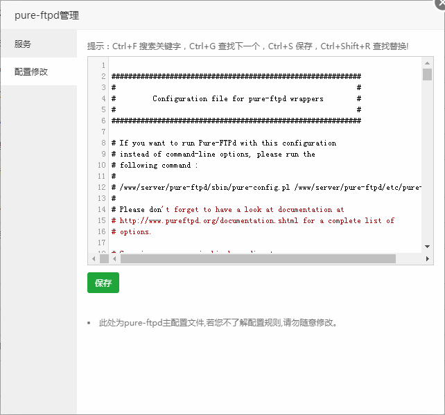 注意事项: 此处为Pure-Ftpd主配置文件,若您了解配置规则,请勿随意修改。