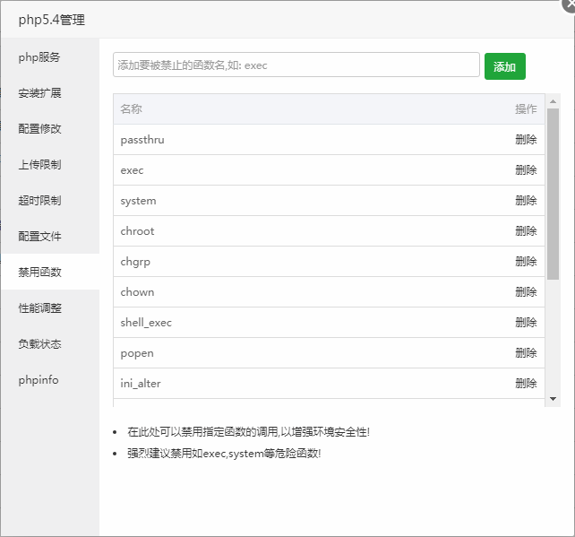 在此处可以禁用指定函数的调用,以增强环境安全性!