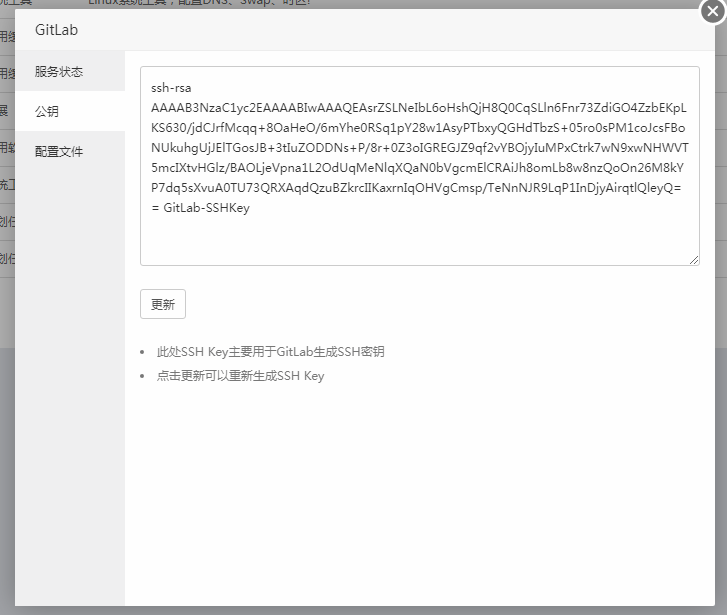 此处SSH Key主要用于GitLab生成SSH密钥,点击更新可以重新生成SSH Key。