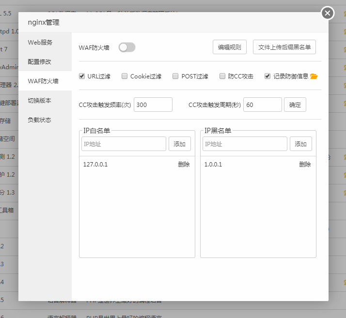 防火墙,开启和关闭WAF防火墙。